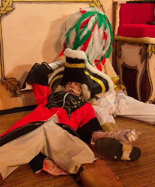 September 2022: Keine Verletzten und nur wenige Überlebende - das ist Theater. Ausstattung zu "Splissi - Schicksalsjahre eines Tanzmariechens im Theater in der Filmdose mit handbemalten Kostümen.